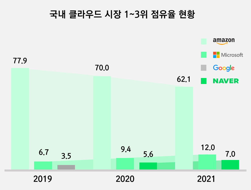 2019년에서 21년까지 아마존이 국내 클라우드 시장의 압도적인 비중을 차지하고 있는 것으로 나타났습니다.